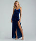 Make a statement in this show-stopping Elara formal velvet dress! She features a sleeveless surplice V-neckline. dazzling rhinestone-embellished spaghetti straps. a curve-hugging slim silhouette with a side pleated seam. and an asymmetrical wrap slit floor-length hem. The formal dress is crafted from a luxuriously soft velvet fabric with plenty of stretch. Complete your look for black tie occasions with earrings and heels.