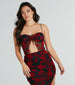 Bring the elevated allure to your next date night in this rose burnout mesh crop top. It features a sleeveless sweetheart neckline with a built-in padded bust. tie-front details with a sultry partial open-front design. adjustable spaghetti straps. and a cropped hem. The sheer mesh fabric features a romantic rose print velvet burnout pattern for a chic vibe. Complete your look with the matching midi skirt and stiletto heels!