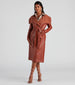 Layer on an elevated and chic style with this faux leather trench. The jacket features a lapel collar. long sleeves. side pockets. a tie-front belt to cinch the waist. and a mid-length. relaxed fit. The smooth faux leather fabric has a moderate stretch. Complete the look with heeled booties.