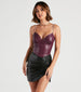 This sleek faux leather corset top will keep your night out look elevated and edgy. It features a sleeveless sweetheart neckline with a bustier-style bodice. chain-link shoulder straps with sparkling rhinestone embellishments. an asymmetric cropped hem. and a form-hugging fit. The smooth faux leather fabric includes a front knit lining. Style with a bodycon mini skirt and heels.
