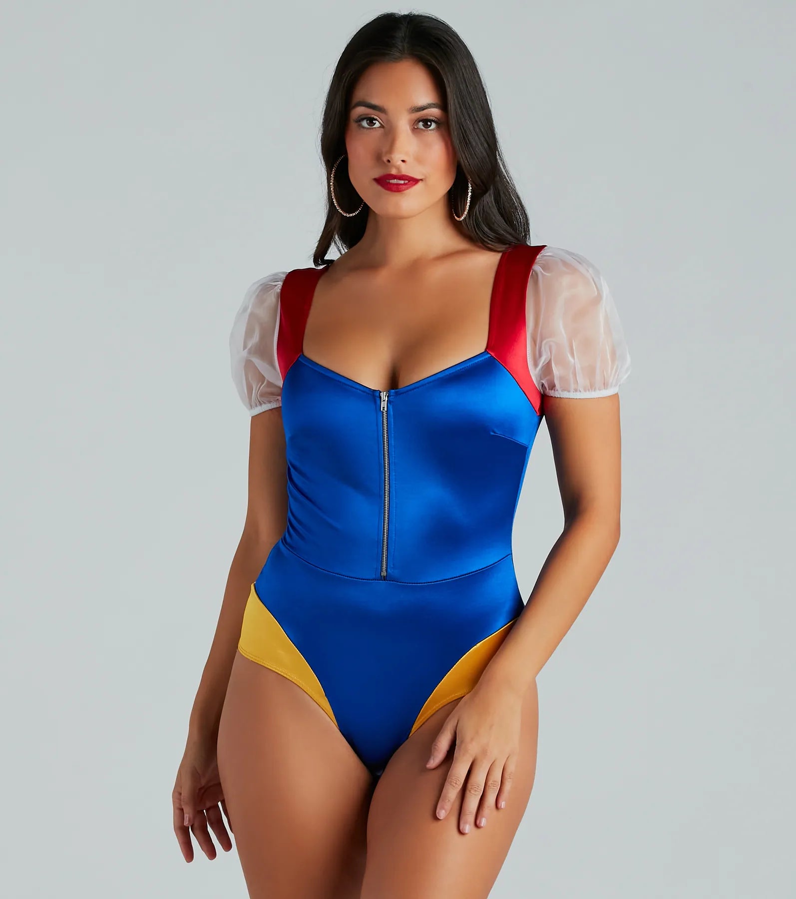 Showcase your ethereal beauty and stay away from those bad apples as an enchanted princess this Halloween! This sleek bodysuit features a subtle sweetheart neckline. a partial zip-front design. sheer full short puff sleeves. a high waist seam. a cheeky bottom. and a form-hugging fit. The satin-knit fabric features an iconic color block pattern. Complete your costume with over-the-knee socks. platform heels. and the rhinestone apple-shaped clutch!