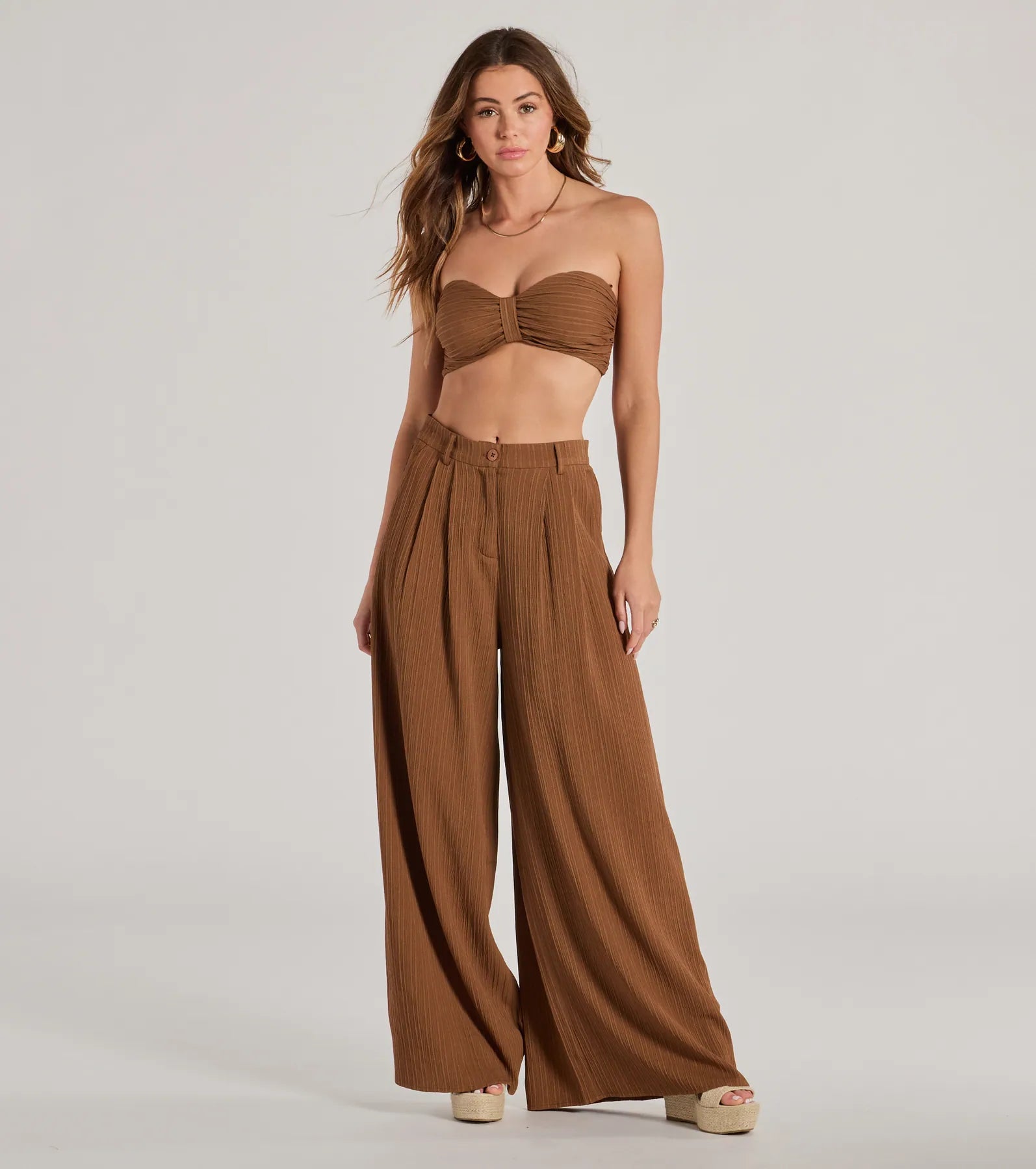 Get ready for vacay packing these trouser pants for endless fun under the sun! Whether you're island hopping in Greece or sipping a mai tai on the beach. these pants will keep you so trendy. It boasts a flattering high-rise waist with side pockets for keeping your hands warm. a breeze wide-leg silhouette. plus a button front and hidden zipper closure to secure the style. Complete the look with the matching top.