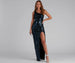 Walk into the room in a formal dress that brings the glamour to your special event. Eris features a sequin scroll pattern. a one-shoulder neckline with a supportive tank shoulder strap. padded cups that provide additional support. and a slim-fit waist. The waist leads to a floor-length form-hugging silhouette that is accented with a high side slit. The dress is composed of a lined mesh fabric that offers minimal stretch. Complete the look with rhinestone heels and a clutch.