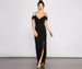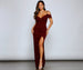 Step out in style this season in the stunningly gorgeous Eva formal dress! She features an off-the-shoulder V neckline with a pleated wrap-front. adjustable spaghetti straps. and a ruched back detail. Her high waist seam flows out to a floor-length A-line silhouette with an asymmetric wrap design creating a thigh-high slit. Complete your look with new heels and a sleek clutch.
