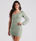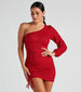 Your evening is looking sparkly in this glitter mini dress for your next celebration! The short dress features a one-shoulder. long balloon sleeve design. front tie ruching on a bodycon silhouette. and a short-length hem. Complete the look in statement earrings.