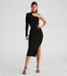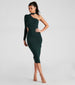 Everyone will only have eyes for you in this one-shoulder sweater dress featuring a long sleeve. flirty choker neck. a side waist cutout. and a form-hugging midi hem with a slit. Pair with strappy stiletto heels to complete the look!