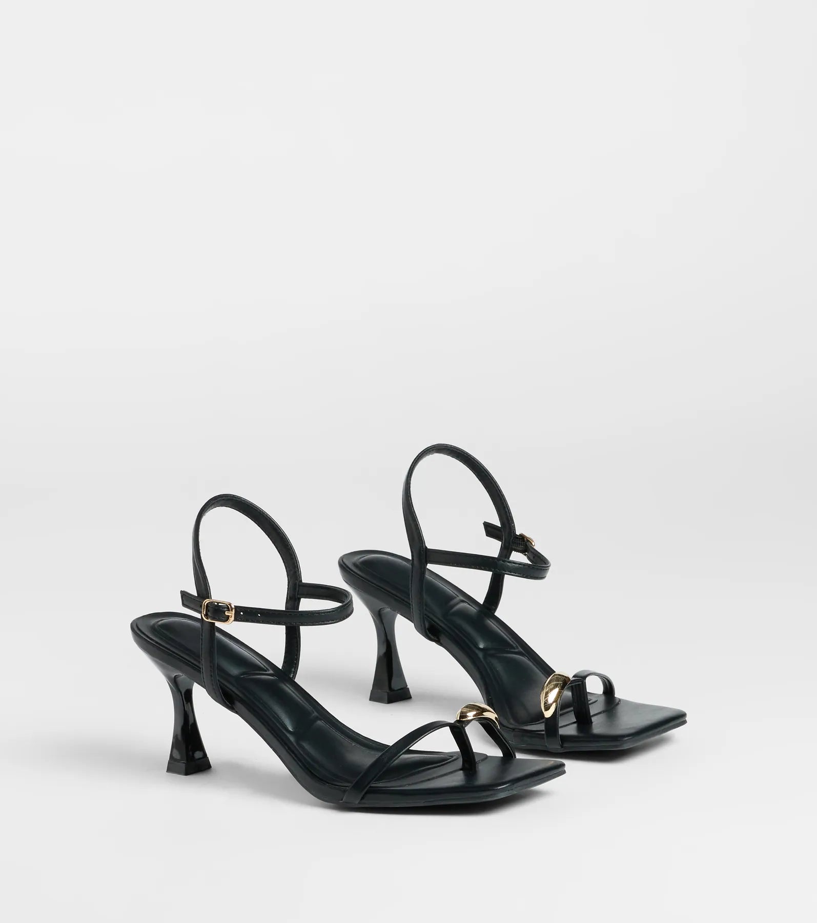 Show off a fabulous strut in these sleek strappy kitten heels with a trendy gold metal ring accent.