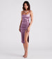 Watch everyone fall for you in this luxe satin midi dress at rehearsal dinners. graduations. and dressy cocktail parties! The dress features a sleeveless square neck. spaghetti straps. a bodycon silhouette. and an adjustable front ruching atop a flirty slit accent. The sleek satin-knit fabric offers a moderate stretch. Complete the look with a stunning collar necklace.