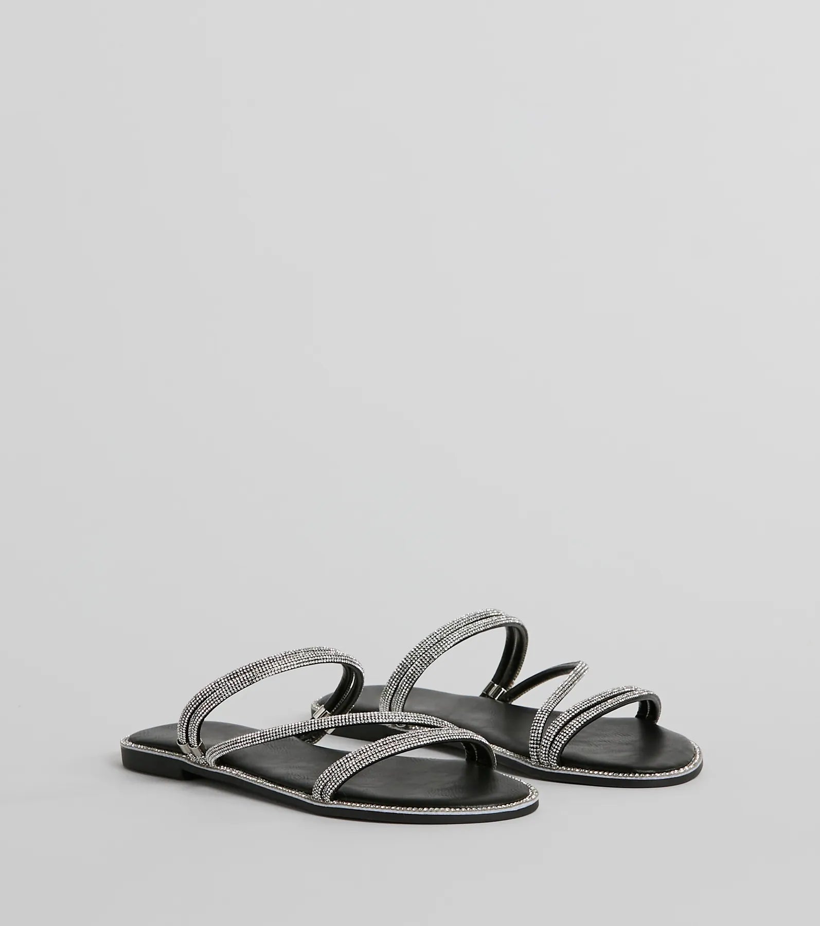 Rhinestone-embellished straps boast a fantastic sparkle to these glam sandals! They feature an almond toe. a strappy design. and a flat faux leather sole with rhinestone embellished trim for extra shimmer. Complete the look with a luxe purse for any occasion!