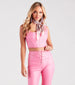 Live your best dream life as an iconic fashion doll! This sleek faux leather corset top features a sleeveless square neckline. tank shoulder straps. flexible boning inserts at the bodice to provide structure. a back zipper closure. and a fitted cropped hem. The lined faux leather fabric features mini rhinestone embellishments all over the front for that stylish and stunning sparkle. Complete your fab look with the matching flare pants and rhinestone boots!