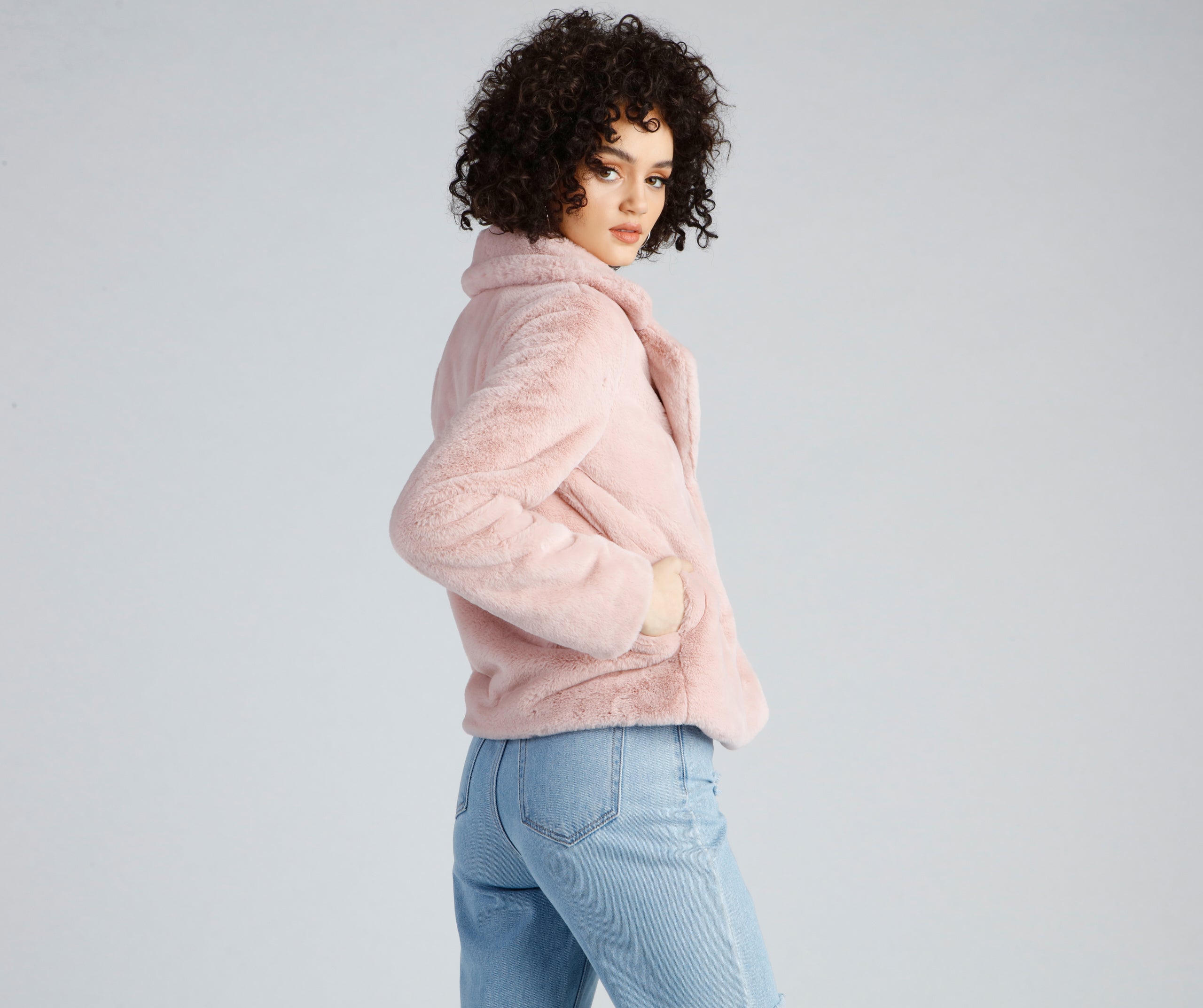 Live out that glam life with a jacket that elevates your cold-weather outfits. The jacket features a collared neckline with a lapel accent. a multi-snap button closure. long sleeves. lined side pockets. and a mid-length hem. The jacket is composed of a lined faux fur fabric that offers a relaxed fit with minimal stretch. Complete look with boots.