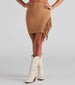Get fab in a fringe skirt that adds that extra detail to your look! The skirt features an elastic high-rise waist. an asymmetrical high side slit with fringe trim. and a mini-length hem. The skirt is composed of a lined faux suede fabric that offers a form hugging fit with a moderate stretch. Complete look with a crochet top and boots.