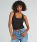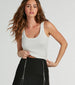 This scoop neck ribbed knit tank top will become your new fave basic to style up! Made with a stretchy lightweight ribbed knit fabric for comfortable wear. this top features a sleeveless scoop neckline. tank shoulder straps. and a mid-length hem with a fitted silhouette. Pair with a mini skirt and combat boots for an effortless edgy vibe.