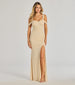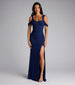 The long formal dress features an off-the-shoulder neckline with cold shoulder strap accents. a sweetheart bust. faux pearls throughout. and a mermaid silhouette accented with a high-side slit. Complete the outfit with a sleek metallic clutch.
