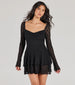 This lace romper features sheer fitted long sleeves. a tie-back design. and a flattering ruffled skater silhouette. Style with heels for any occasion.