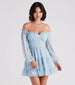 Look and feel like a dream in this chiffon skater dress perfect for baby showers or birthdays! It features an off-the-shoulder. ruffle trim sweetheart neckline. sheer peasant long sleeves with elastic cuffs. a lightly padded bust. and a flowy tiered ruffled short-length hem. Complete the look in cute mules.