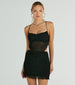 Feel daringly stylish with this crop top! This ultra-trendy top features a sleeveless V-neckline. bungee spaghetti straps. an alluring open back with a strappy design. and a vivid V-cut cropped hem on sheer texture knit fabric. Dare to stand out and shop the matching bottoms to complete the look!