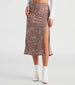You'll be feelin' fab and fierce in this adorable leopard printed midi skirt. It features a high-rise waist. a chic high front slit. and a mid-length. relaxed silhouette. Style this skirt with a basic bodysuit and cute mules.
