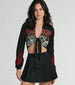 Rev up your style in this graphic crop top to stand out at concerts and festivals! The long sleeves with banded cuffs and V-neckline add a touch of edge. while the tie-front and front graphic featuring "Racing" verbiage add a bold statement and is finished with a cropped hem to flaunt your figure. Complete the look in a denim mini skirt and combat boots!