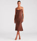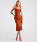 This smooth and sleek satin-knit midi dress will showcase your beauty and give you a figure-flattering silhouette. It features a sleeveless cowl neckline. bungee spaghetti straps that lead to a cross-back strap design. a hip-hugging fit. and a midi-length hem with a fitted A-line silhouette. The satin-knit fabric offers plenty of stretch. Style with clear heels for happy hour!