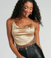 Show off your flawless allure in this slinky knit fringe hem crop top! Designed with a sleek stretchy knit fabric with a fabulous sheen. this is the perfect going-out top for nights out with your squad. It features a sleeveless cowl neckline for that chic draped look. and bungee spaghetti straps that lead to a sultry open back with a cross-back strappy design. The angled cropped hem is accented with a ball-chain fringe for a trendy vibe. Style this form-hugging top with faux leather pants and clear heels.