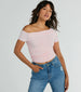 Create a simply flawless 'fit with this trendy off-the-shoulder smooth knit top! Designed with the iconic smooth double-lined knit fabric. it offers an ultra-soft buttery feel and plenty of stretch for comfortable wear. The top features an asymmetric off-the-shoulder neckline with pleated detailing. short fitted sleeves. ruching down the side seams to accentuate your curves. and a mid-length hem with a form-hugging fit. Style with your fave pair of denim!