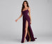 Bring the glamour to your evening with a formal dress that makes a breathtaking entrance! Fleur features a sleeveless cowl neckline. spaghetti straps. lace-up straps. dual high side slits. and an A-line silhouette. The dress is composed of a smooth knit fabric that offers a moderate stretch. Complete look with rhinestone heels and a cuff.