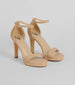 Step out in these nubuck stiletto heels for a flirty and fun style! The heels feature an open almond toe. a wide toe strap. a platform sole. a stiletto heel. and a closed ankle with an adjustable strap with buckle closure. Complete the look with a chic crossbody bag for day or night plans!