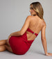 • Open back with bar detail. lower ruched seam