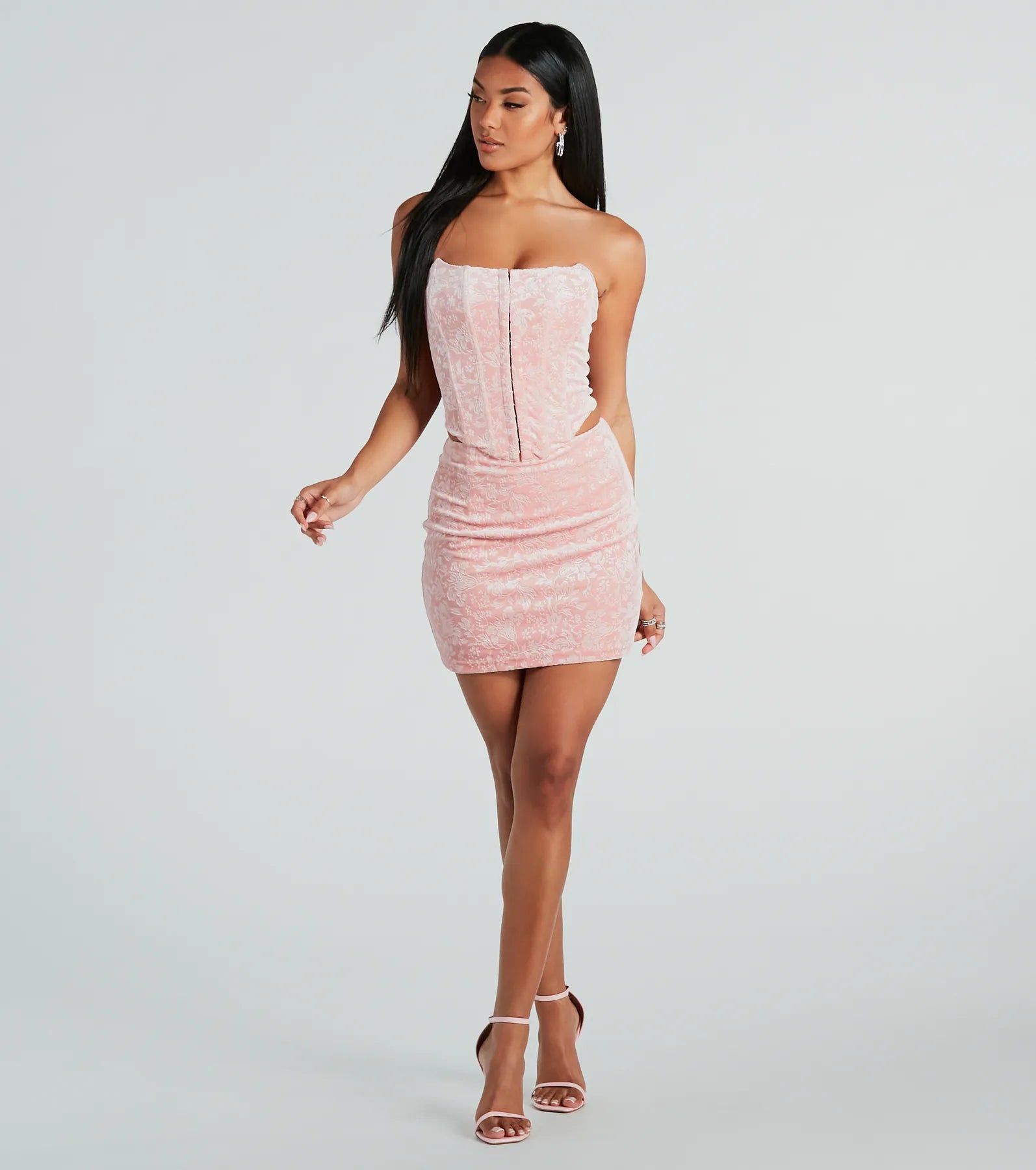 Reserve a seat at a chic restaurant wearing this floral velvet bustier! Made of luxurious flocked floral velvet fabric. it features flexible boning and hidden front hook and eye closures for a secure fit. With a flattering cropped hem and romantic lace-up back. you'll feel like a vision in this dreamy piece! Style with the matching skirt.