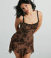 Flirt up the night with the alluring details of this floral burnout mini dress! The stretchy sheer mesh fabric is accented with a floral velvet burnout pattern for that chic flair. The mini-length dress features a sleeveless scoop neckline with a cute tie-front detail. adjustable lace spaghetti straps for a customized fit. and a dainty lace trim at the neckline and empire waist seam. The effortless A-line silhouette flows out to an asymmetric ruffled hem for a trendy touch. Style this short dress with strappy stilettos for a rooftop bar!