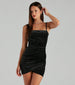 Radiate glamour and confidence with this glitter velvet party dress! This eye-catching dress features an alluring silhouette. with a square neck. spaghetti straps. and an open strappy back. Crafted in glitter velvet fabric. it hugs your curves with its bodycon silhouette and a wrap mini-length hem. Complete the look with a necklace and earrings.