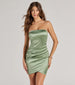This sleek satin-knit mini dress features a strapless straight-across neckline. pleated detailing at the front to accentuate your curves along the bodycon silhouette. and a faux wrap-front design creating an asymmetric mini-length hem. Style with strappy stilettos.