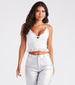 This tank crop top deserves a moment to admire its cuteness! Featuring a sleeveless mesh ruffle trim sweetheart neckline. bungee spaghetti straps. a flirty front bust tie with a keyhole accent. and a mesh ruffled trim hem on stretchy rib knit fabric. Complete the look in high-rise jeans and mules for a coffee meet-up!