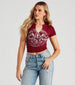 Live life on the edge in this trendy cropped graphic tee! It features a crew neckline with a cut notched front design. short sleeves. a motorcycle and wings graphic with the scripts "Full Throttle" and "Live To Ride. Ride To Live." and a form-hugging fit. The cotton-blend fabric offers a moderate stretch. Style with distressed denim.