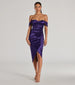 The Gaia formal satin dress features a sweetheart neckline with off-the-shoulder short sleeve accents. a ruched faux wrap silhouette. and a midi-length hem. Complete your cocktail outfit with block heels.