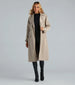 Mystery solved! This trench coat is the perfect essential to layer over all of your 'fits this season. The coat features long sleeves with buttoned straps on the cuffs. a lapel collar neckline. double-breasted front button closures. side flap pockets for keeping your hands warm. an adjustable belted waist with buckle closure. and a longline hem. Complete the look with chic knee-high boots.