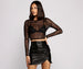 Get spotted in this chic top that makes a glam statement! The top features a sheer unlined mesh fabric. a leopard spot design. and glitter embellishments throughout. Complete your night out look with a black mini skirt.