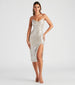 If you're looking to sparkle this glitzy sequin midi dress is the perfect shimmery option! The short dress features a sleeveless V-neckline. bungee spaghetti straps. a form-hugging silhouette. and a front-slit accent. Complete the look with a glam hair accessory for a flawless updo!
