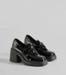These faux leather loafers feature a sleek closed design. a platform sole that elevates the style. and a block heel. Perfect for styling with a blazer for a posh look.
