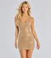 Glam up the night in this dazzling mesh mini dress designed with all-over square-shaped rhinestones for that gorgeous shine. It features a sleeveless V-neckline with halter straps and a short bodycon silhouette to hug your stunning curves.