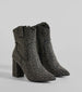 Fabulous and memorable. take these rhinestone denim booties for a glamorous look out west or at the country festival! They feature a pointed toe. side zipper closure for easy wear. a block heel. and a Western-inspired design. Complete the look in a must-have cowboy hat.