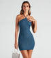 Bring the sparkle on your next girl's night out in this glitzy glitter mini dress. It features a sleeveless halter neckline with spaghetti straps. a partially open back. and a short. form-fitting silhouette that will hug your curves. Style with rhinestone fringe earrings and an embellished evening bag.