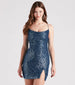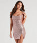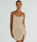 Bring the glam energy with this glitzy sequin embroidered mini dress! It features a sleeveless cowl neckline. bungee spaghetti straps that lead to a cross-back design. a short. curve-hugging fit with a front slit. and all-over sequin embroidery. Complete the look with rhinestone earrings.