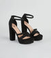 Reach a glitz and glam status with these rhinestone platform heels featuring an almond toe. dual top straps. a closed ankle. block heel. and an ankle strap with buckle closure on faux suede material. Complete the look in a sassy satin dress for drinks and dancing!