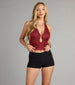 The shimmer is real—this halter top is built for nights when you want all eyes on you. Pair it with leather. denim. or your best dance moves.
