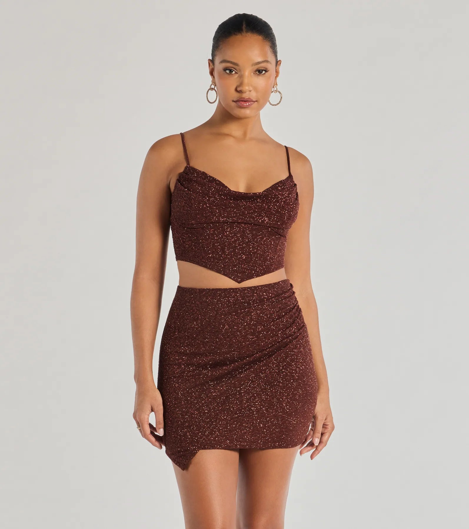 Dazzle in this sleeveless glitter crop top. With a cowl neckline. adjustable straps. and asymmetrical hem. it's your go-to for a night out. Pair with the matching mini skirt!