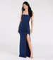 Shimmer with every step in the glam Drew glitter floor-length dress designed with a revealing open back and high front slit to show skin along the mermaid silhouette. Pair with earrings.