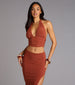 Embrace your daring side and let this crop top elevate your look. Its sleek halter neckline and cropped fit highlight your confidence and flair. perfect for making a statement at any event. Pair with the matching skirt.
