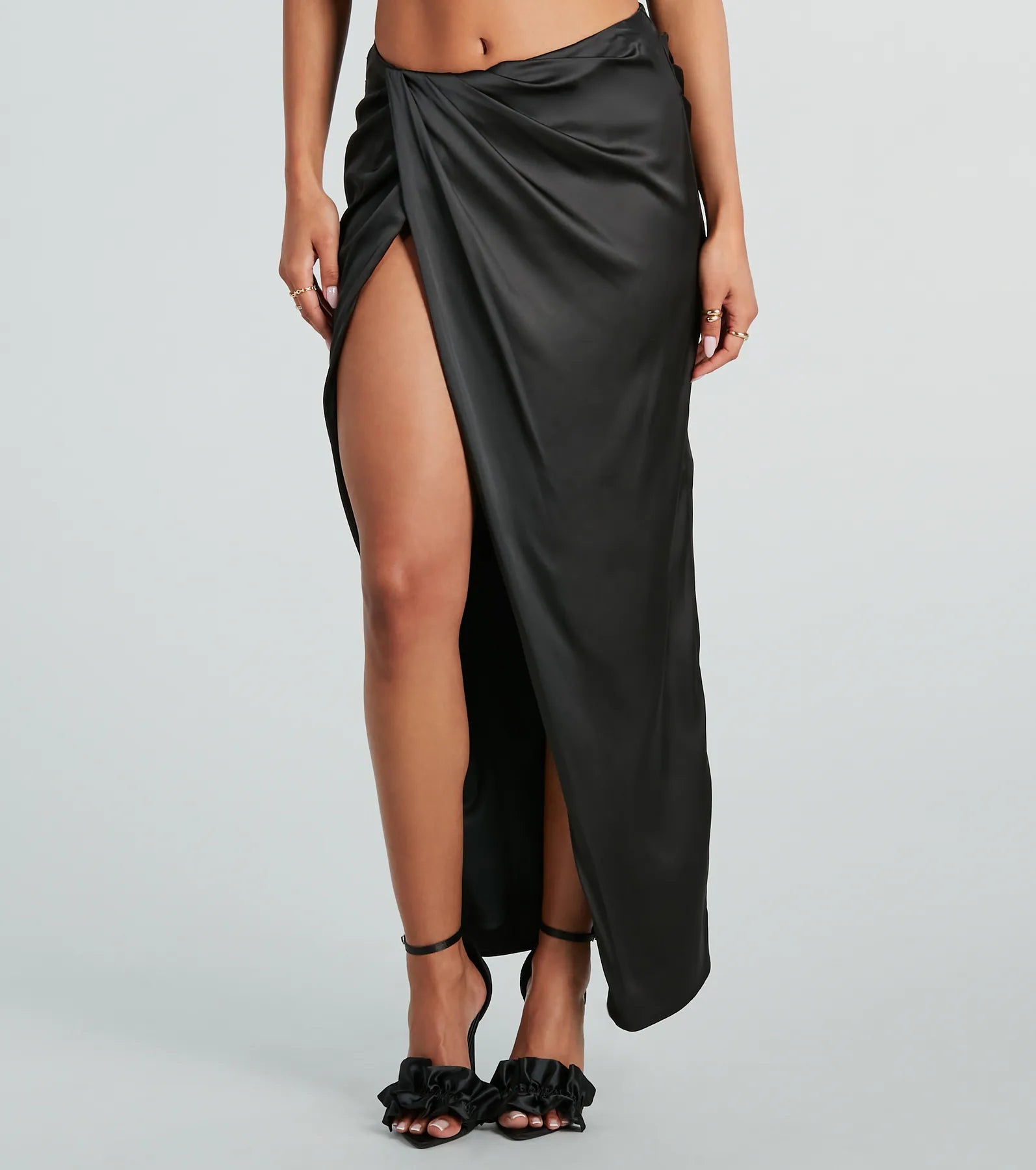 Make a gorgeous impression in this sultry satin midi skirt for date nights! Designed from silky satin woven fabric. this slim-fit skirt accentuates your curves in a mid-rise silhouette with an elegantly crafted surplice detail and high slit perfect for showing off some skin. Complete the look in a lace bustier and cute heels for a striking style!